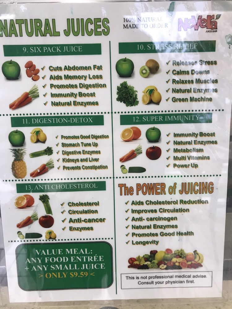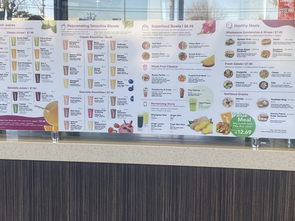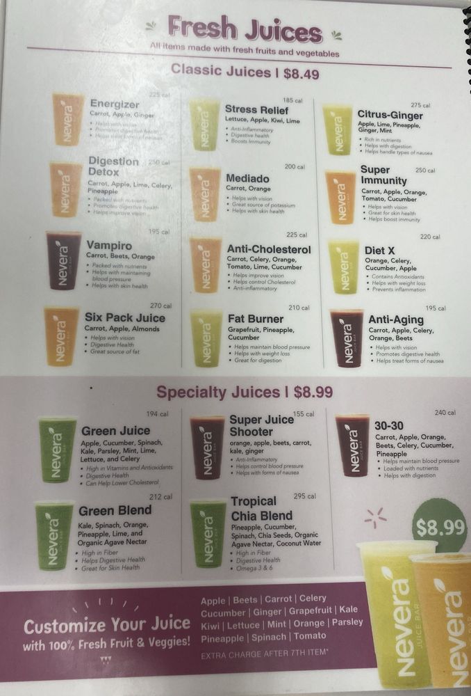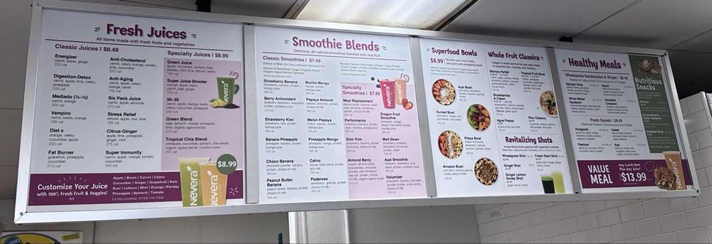 Nevera Juice Bar in Downey, CA offers a diverse menu of fresh juices, smoothies, and sandwiches. With options for vegan protein and customizable sweeteners, customers like Daisy A. and Ayoub A. praise their nutritious and delicious offerings. The 30-30 Super Juice is a standout favorite for its blend of fruits and veggies. The friendly staff, quick service, and top-notch quality keep guests like Cesar R. and Natalie H. returning for more. From meal replacement smoothies like the Banana Chocolate to refreshing options like the Peanut Butter and Banana, Nevera Juice Bar caters to a variety of tastes and dietary preferences. Whether you're looking for a healthy boost or a satisfying meal, this Latinx-owned establishment is a must-visit for a flavorful experience.